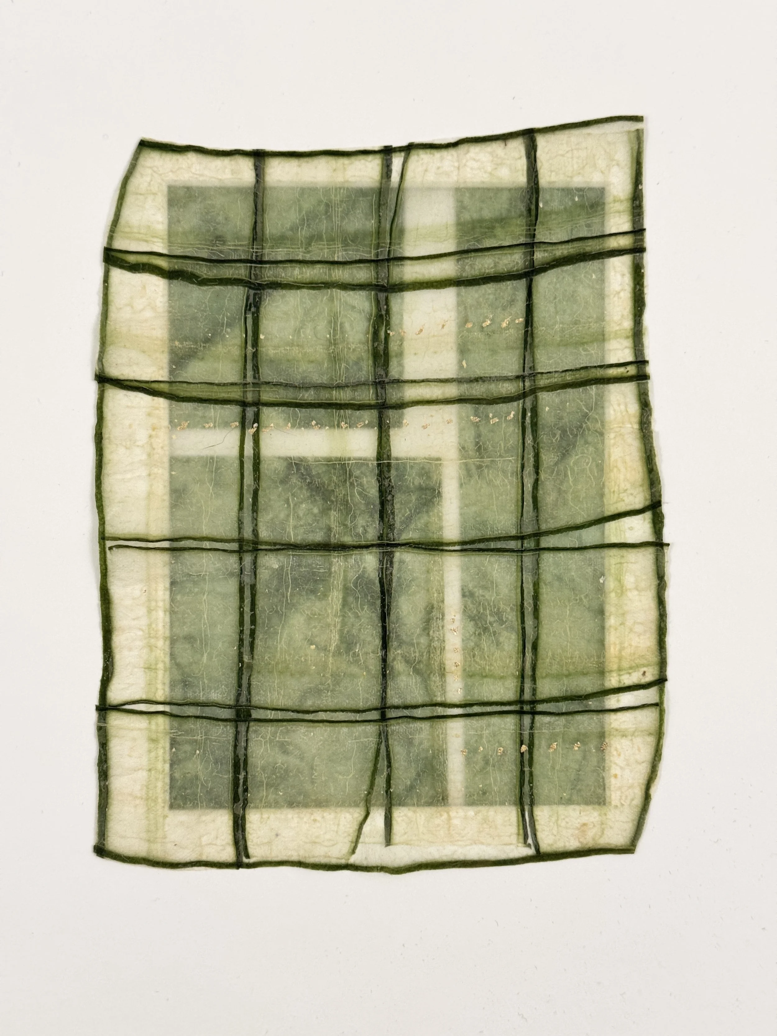 Vert I, slivered, dried cucumber slices; handmade paper; gold leaf ink, 14 x 11"