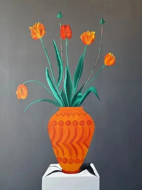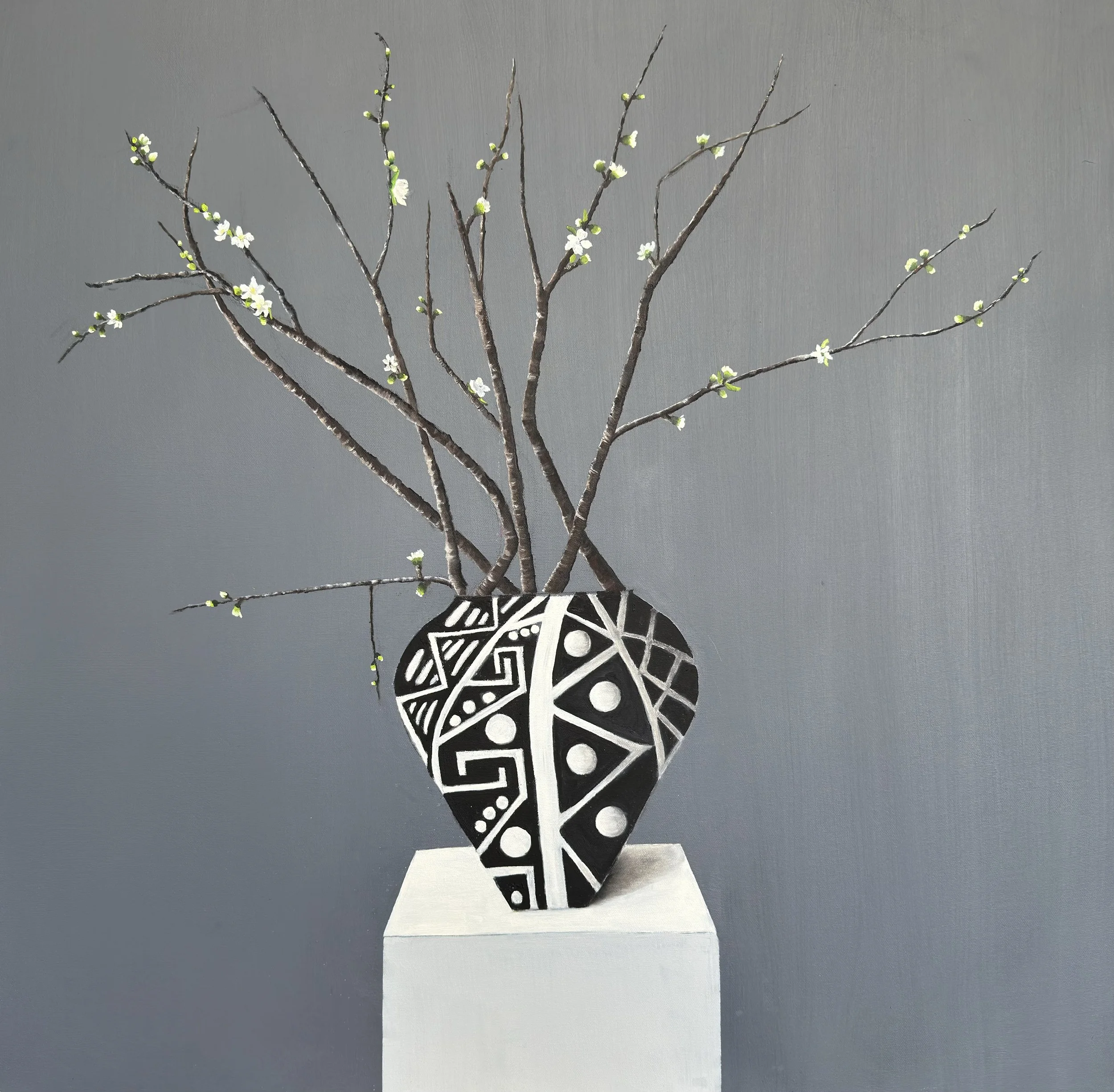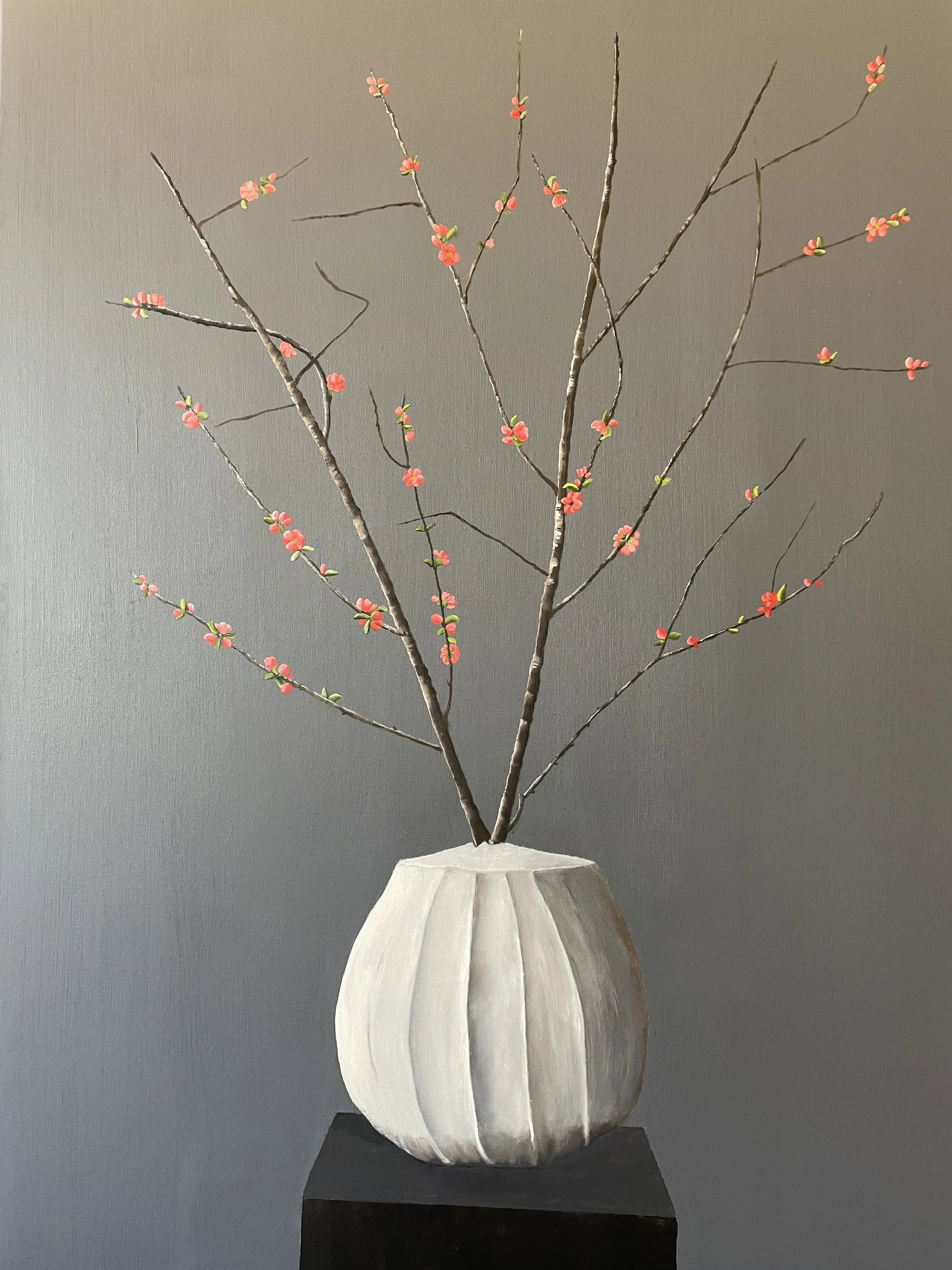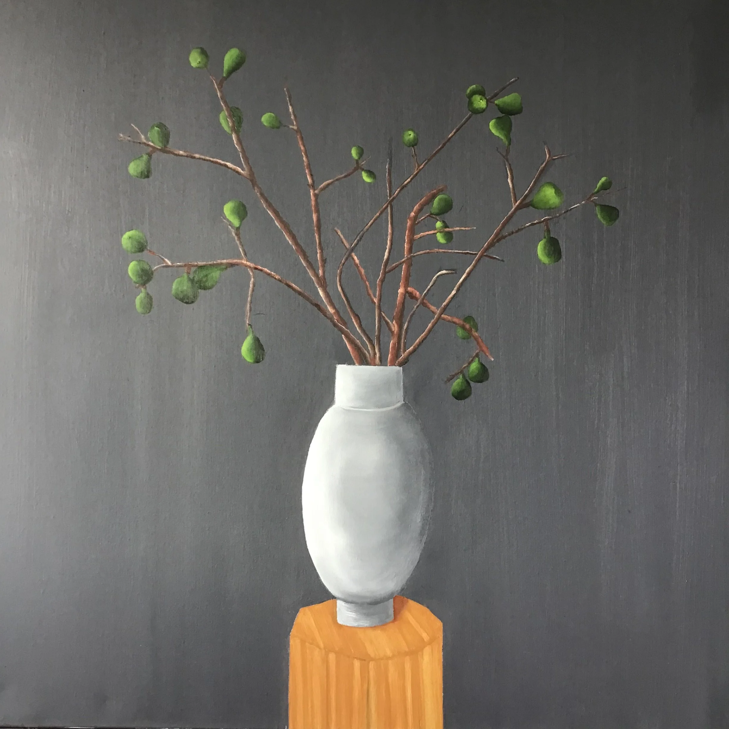 The still lifes I create are contemporary; they provide a contrast to the traditional opulence found in the Dutch still-life tradition. My work alludes to the classical themes such as memento mori in the rendering of broken branches or withered leaves and in my celebration of everyday objects. As for inspiration, I rely on arrangements drawn from life, personal photographs, and imagery collected from various sources. Often the flowers and vessels in which they are arranged are placed on pedestals, testament to how much I treasure the calm they afford.” -LE