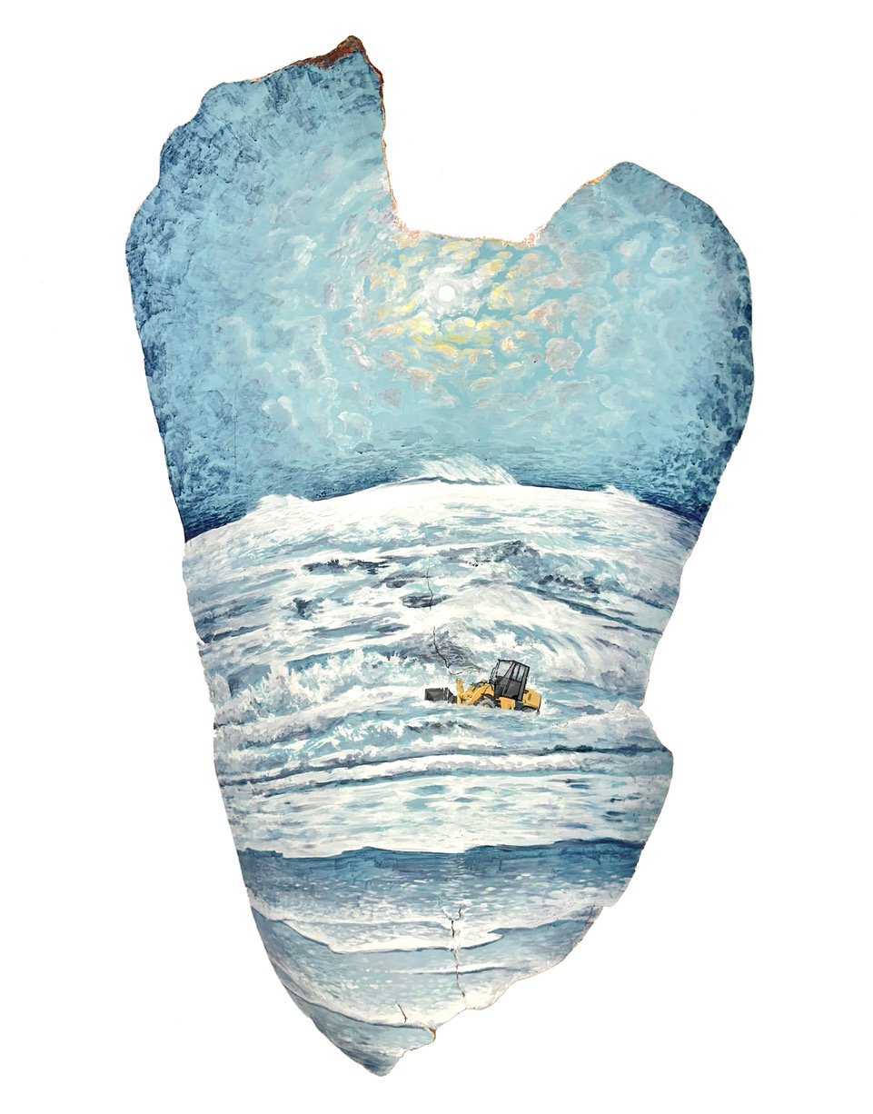 “Winter Storm”, acrylic on found fiberglass boat hull fragment, 51” x 32” x 9”, 2024